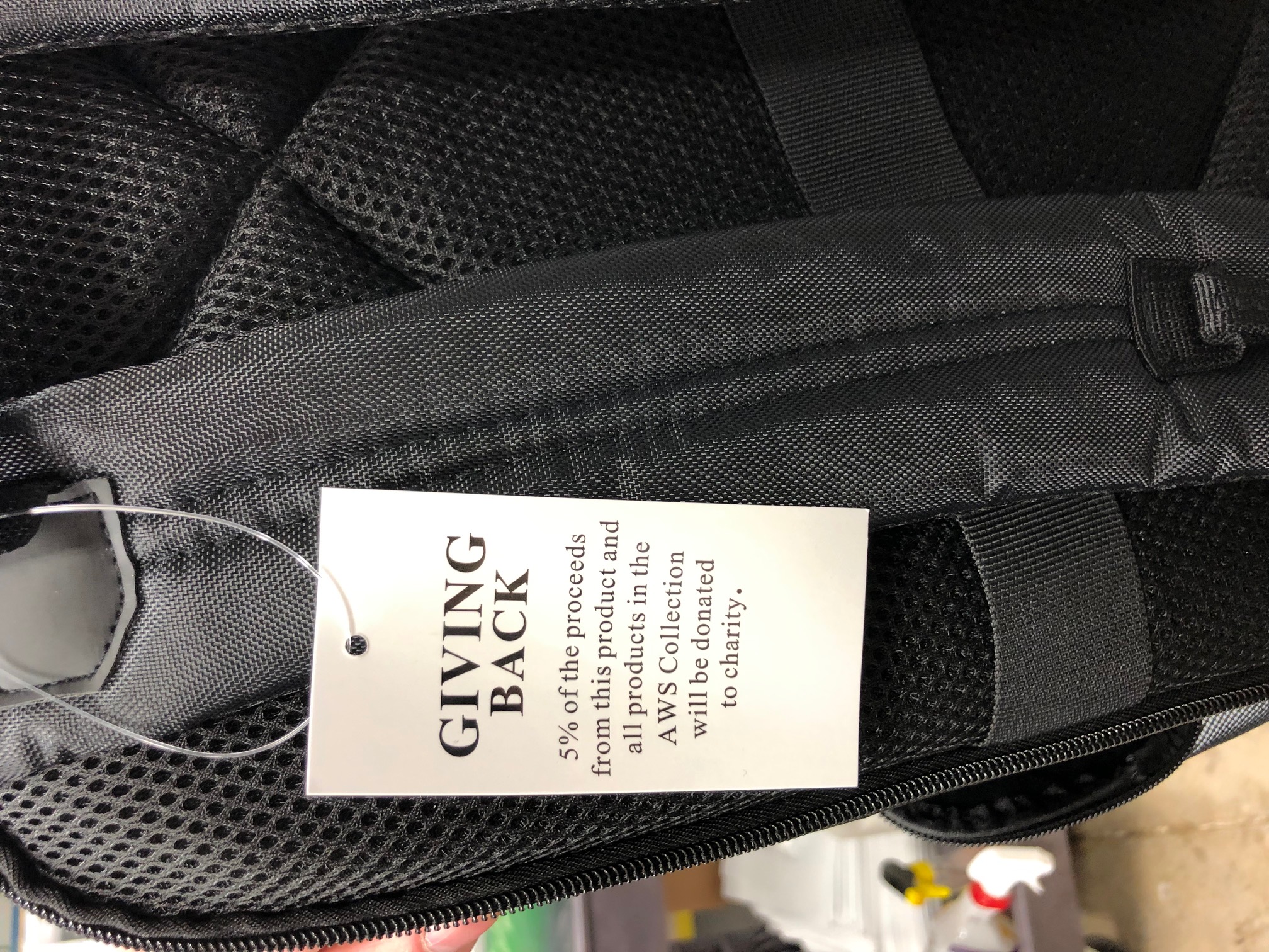 AWS: The AWS line boasts a variety of items from bags and wallets to umbrellas and sunglasses. As a way to give back, the company donates five percent of proceeds to the following five charities (one percent to each): Shriner’s Hospital for Children, American Cancer Society, Boys Town, Make a Wish, and St. Jude Children’s Research Hospital. A hang tag in included on all merchandise purchased within this collection.